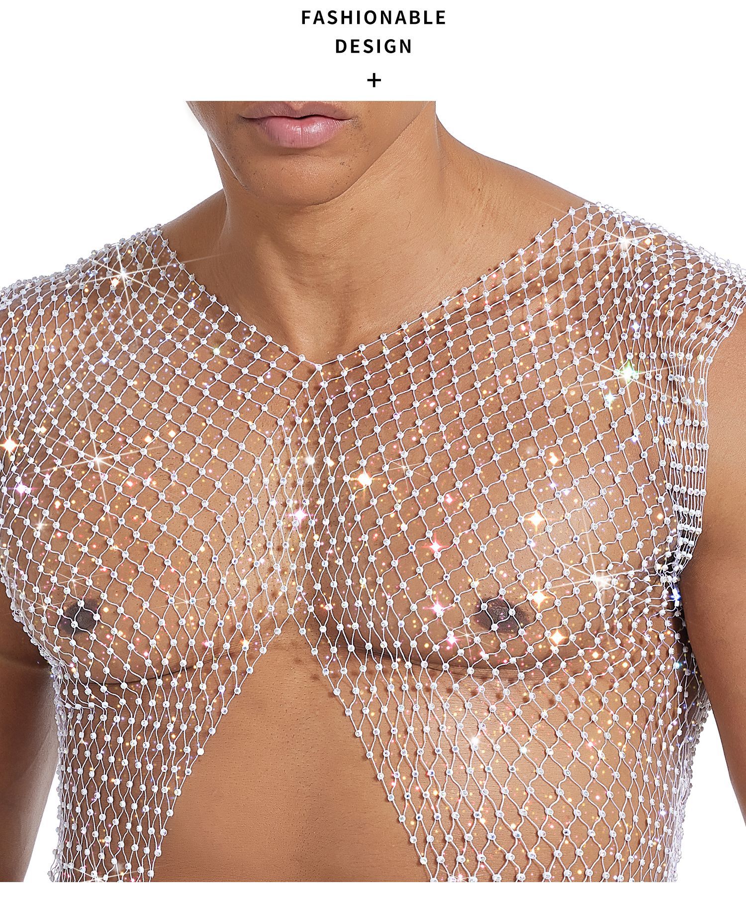 A rhinestone-studded fishnet top made to layer over bras, harnesses, or bare skin under stage lights.